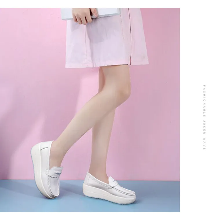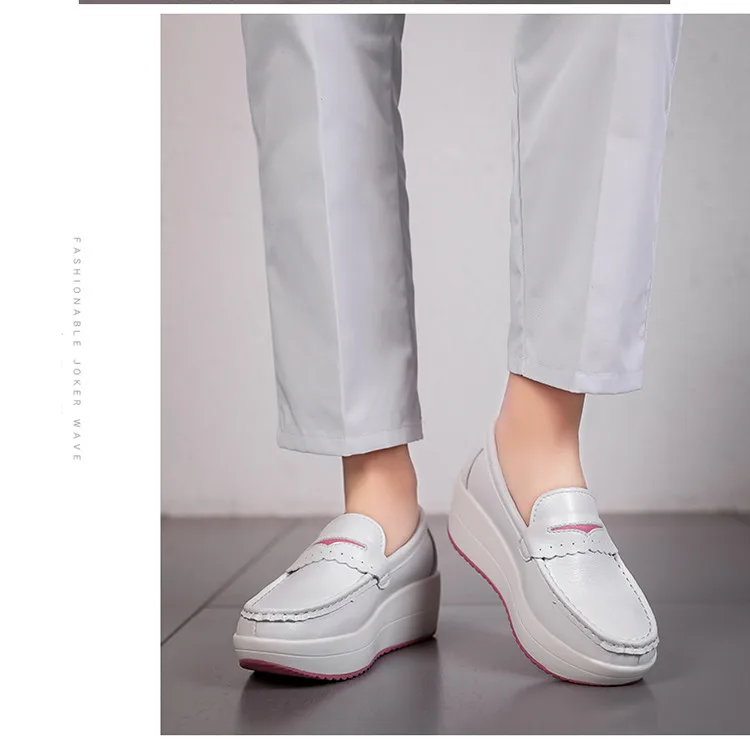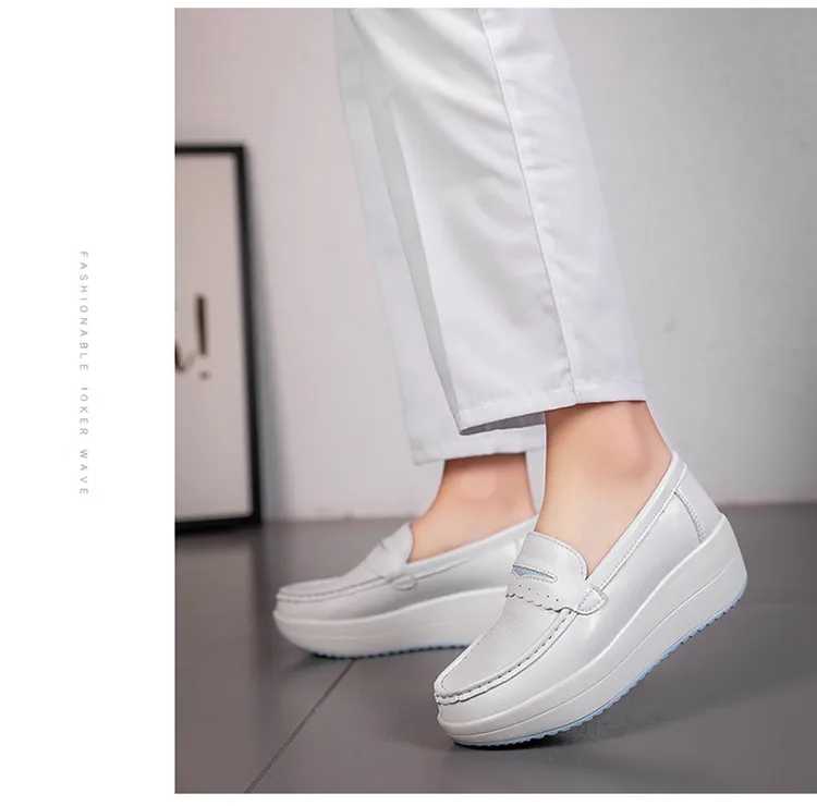 حذاء كاجوال بنعل سميك للنساء ، أحذية ممرضة ناعمة للعمل ، تنفس ومريح ، مانع للإنزلاق ، جلد أبيض ، حذاء بدون كعب للرضاعة