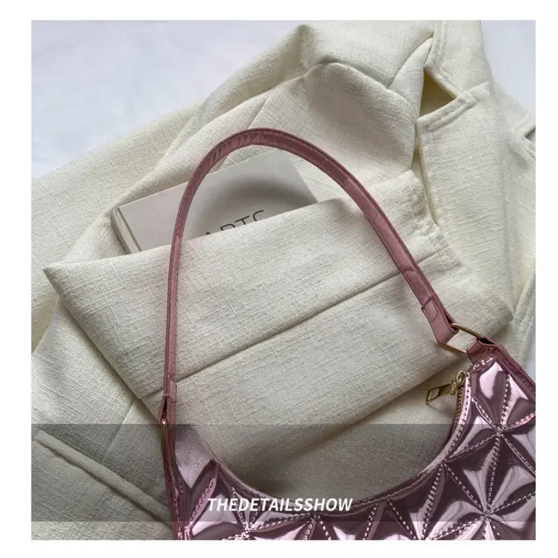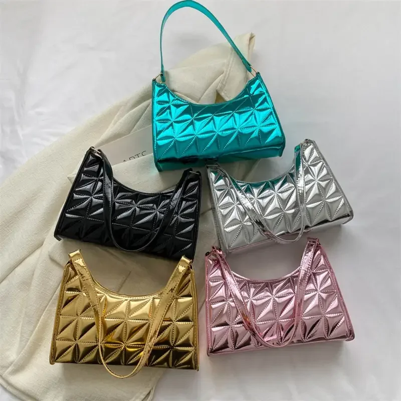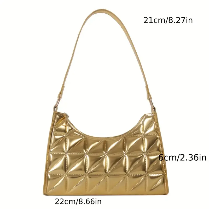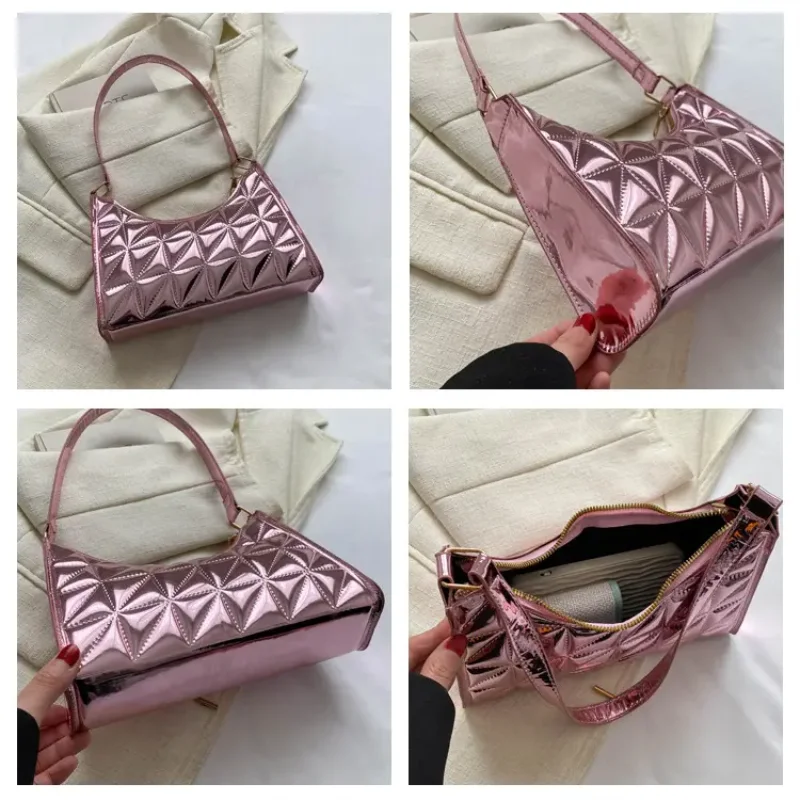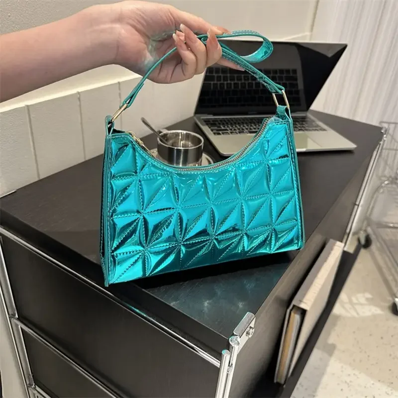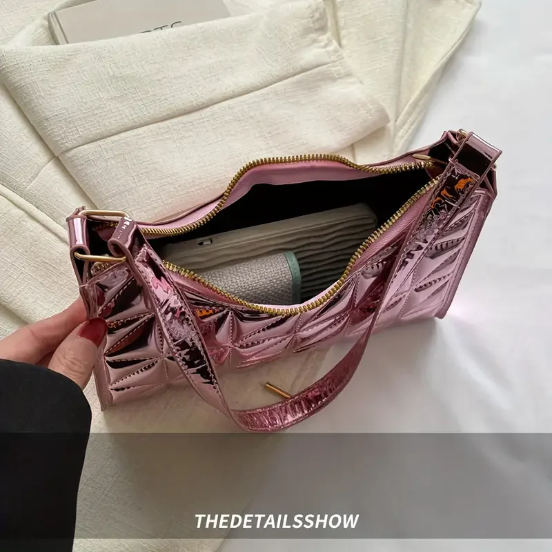 حقيبة كتف مبطنة لامعة للنساء ، محفظة تحت الإبط بلون معدني ، حقيبة يد أنيقة
