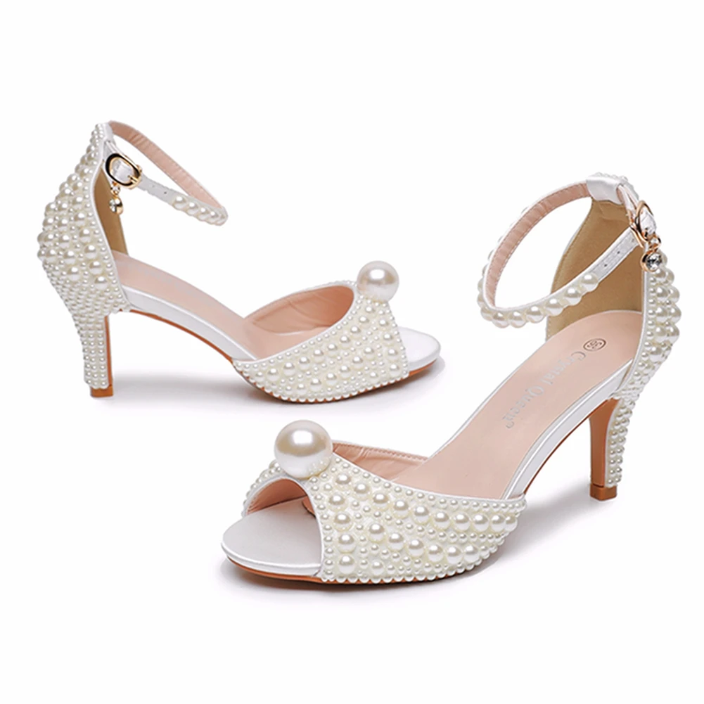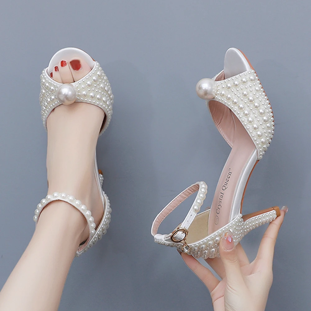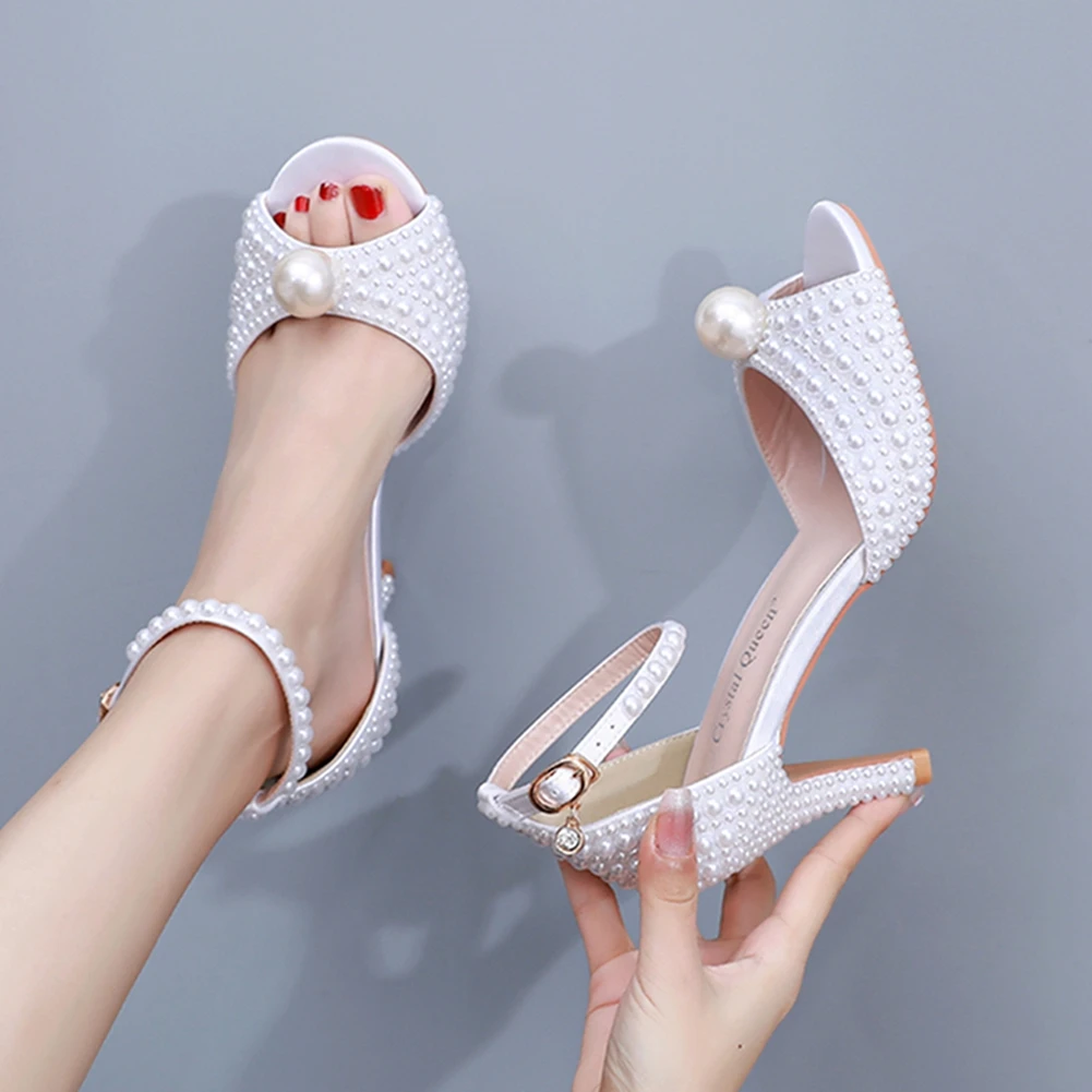 كعب عالي مفتوح من الكريستال للنساء ، حذاء زفاف فاخر للسيدات ، فستان مأدبة ، صندل لؤلؤ أبيض ، خنجر ، موضة