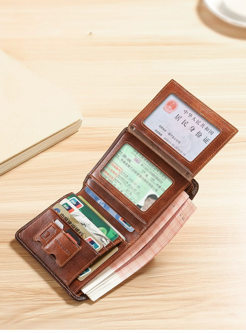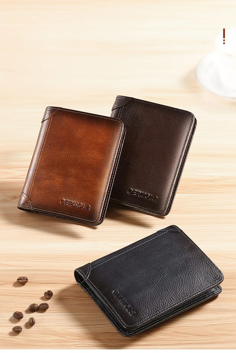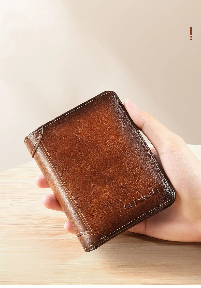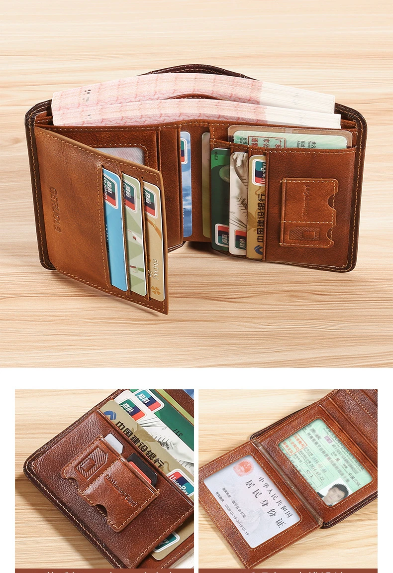 محافظ جلد طبيعي لمنع تحديد الهوية بموجات الراديو للرجال ، ثلاثية الطيات ، عتيقة ، قصيرة ، متعددة الوظائف ، حامل بطاقات الائتمان ، مشابك نقود ، بنية