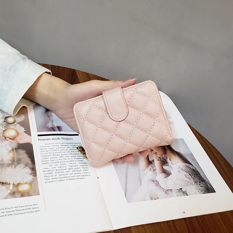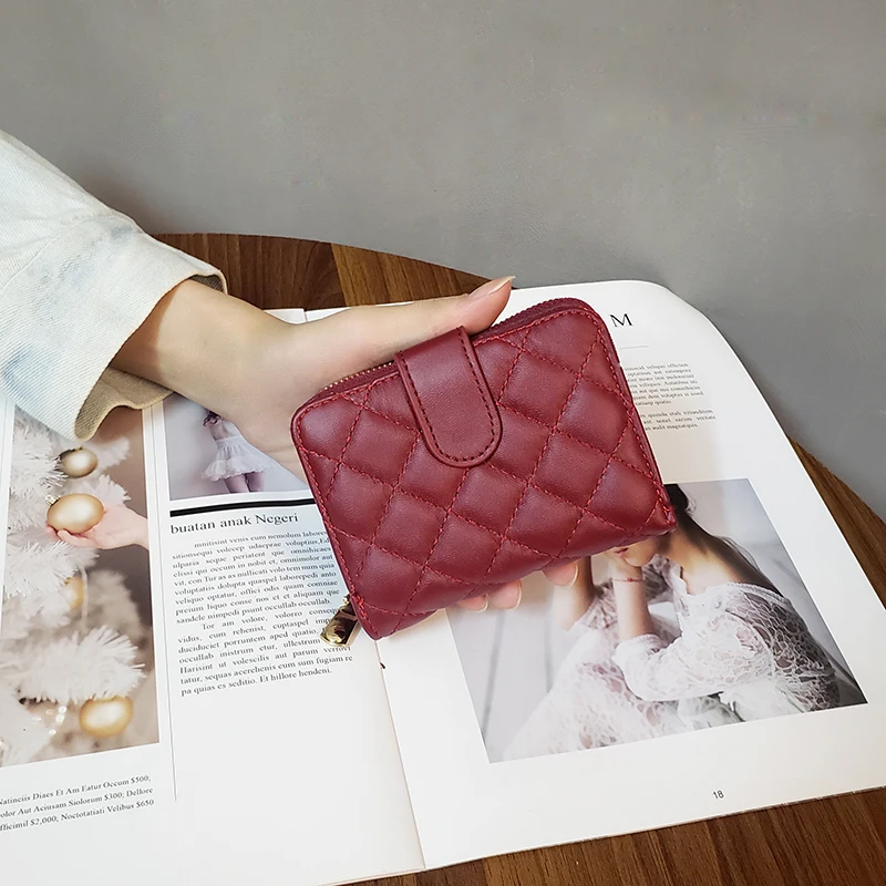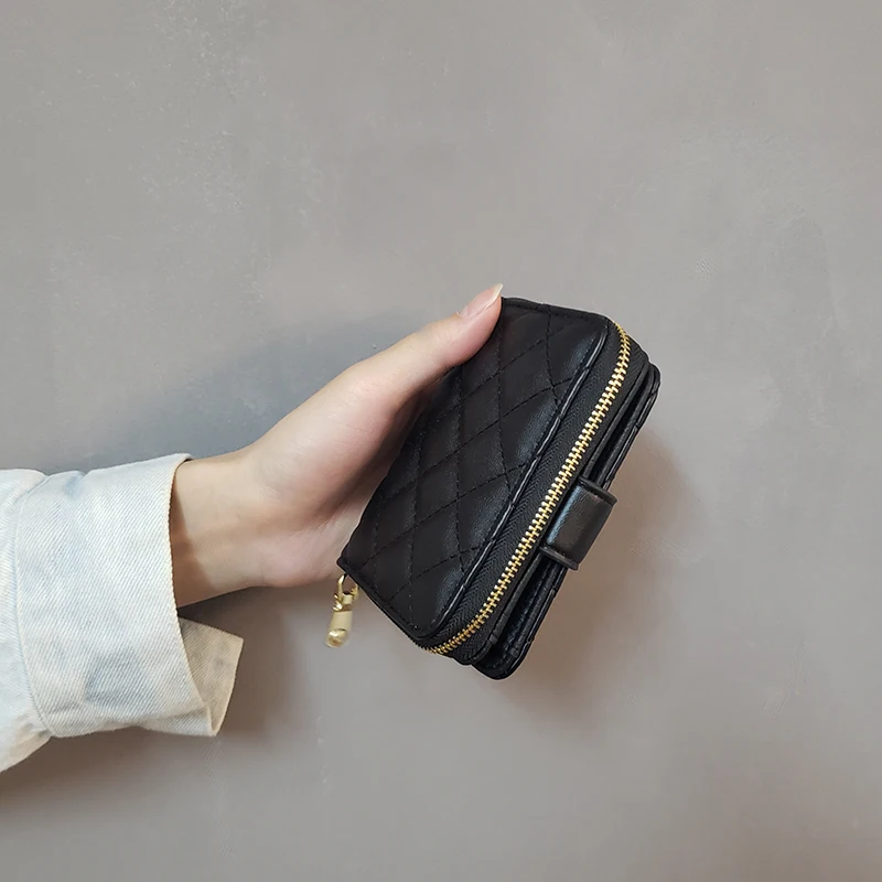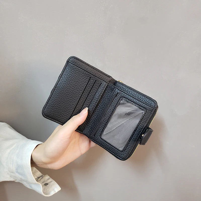 محافظ قصيرة مواكبة للموضة من جلد البولي يوريثان حقيبة نقود رفيعة ورقيقة مزودة بسحّاب غير رسمي أسود بمشبك بسعة كبيرة